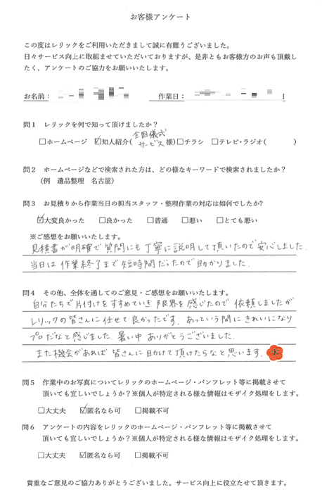 すぐに処分せず、必ずお客様に確認を取りながら進めます。