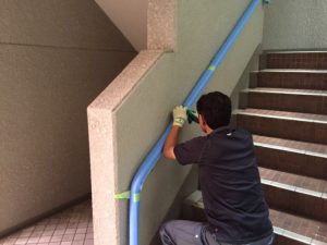 現場は名古屋市東区にあるマンションの為、共用部分の養生作業も欠かせません。