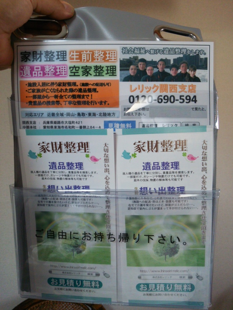 レリック関西支店の遺品整理、家財整理、生前整理、特殊清掃、空家整理、ゴミ屋敷整理を兵庫県、地元の播磨地域、姫路市、加古川市、高砂市、西脇市、三木市をはじめ、その周辺の明石市、神戸市、たつの市、西宮市、豊岡市など県北部・日本海側など幅広いエリアの方々に知って頂ける機会の一つになればと思います。