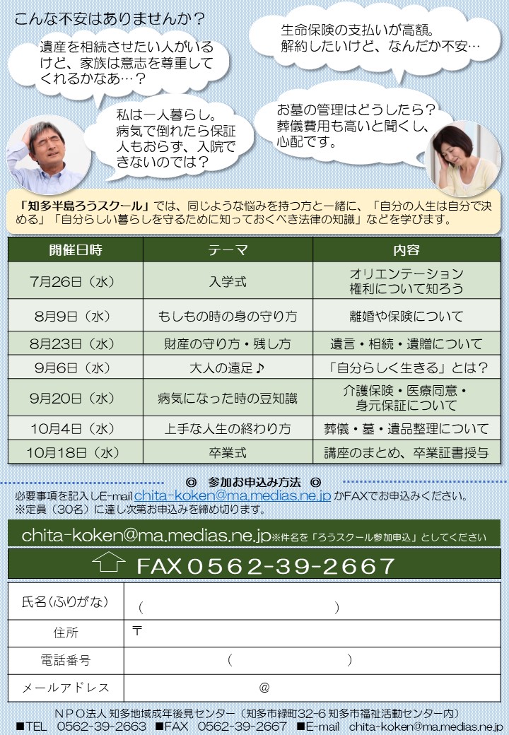 当セミナーに参加してみたいという方は、是非、NPO法人 知多地域成年後見センター(知多市緑町32-6 知多市福祉活動センター内)■TEL 0562-39-2663 ■FAX 0562-39-2667へお問合せしてみてください!