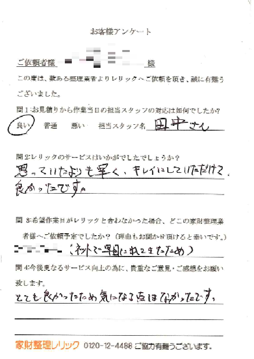 当初は違う整理業者へ依頼を検討されていたようでしたが、連絡がうまくつかず、様々な媒体を通してレリックを見つけて頂き感謝です。 お客様のご希望に寄り添う作業が出来たとこはとてもうれしく思いますが、お客様からのHPなどもっと広く宣伝するとよいというお言葉を真摯に受け止め、レリックの整理サービスで一人でも多くの方のお手伝いができるように努めていきます。